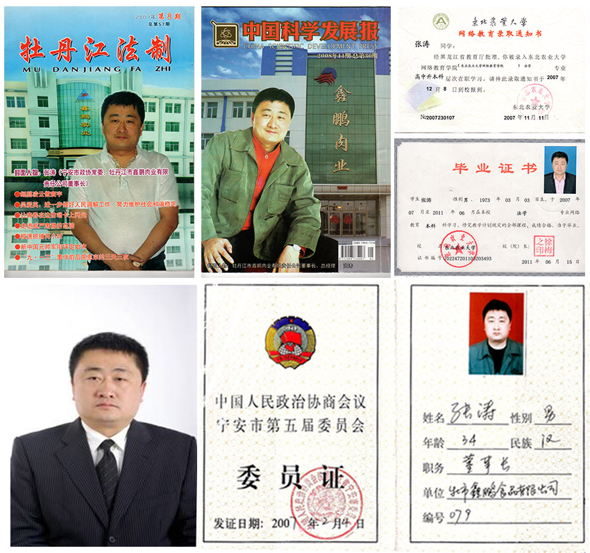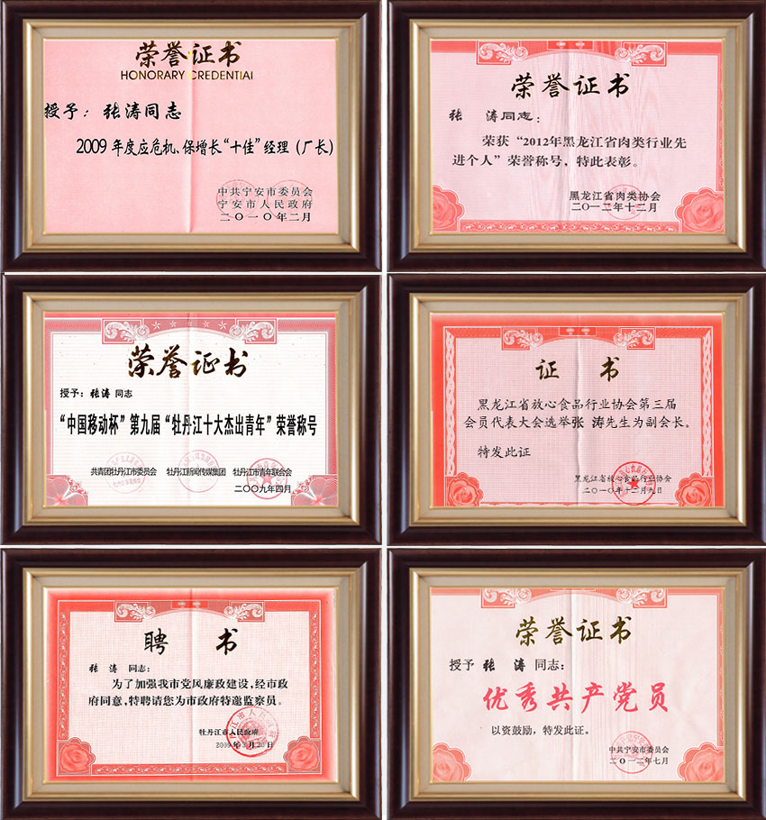 张涛,男,1973年出生,中共党员,大学文化,食品加工高级工程师,系牡丹江市鑫鹏肉业有限责任公司董事长及总经理。 张涛董事长自2006年11月任牡丹江市鑫鹏肉业有限责任公司董事长及总经理以来,无论从事边贸业务,还是担任企业领导,都能把扎实的工作作风放在首位,工作以身作则,勤奋敬业,食品加工的理念知识和技术精湛,具有较丰富的实践经验和解决复杂技术问题的能力,经常帮助兄弟单位解决食品生产与销售中存在的技术难题,为本地区食品工业的生产与对俄贸易做出了突出贡献,得到各级党委、政府及社会组 织授予的各种荣誉: 曾荣获共青团牡丹江市第七届“十大杰出青年”;共青团宁安市第七届“十佳杰出青年”,荣获牡丹江市委组织部、市人力资源和社会保障局、共青团牡丹江市委员会授予张涛同志首届“牡丹江市青年拔尖人才称号”;荣获黑龙江陆军预备役步兵师授予“******预备役军官”;荣获中共牡丹江市委员会、牡丹江人民政府授予“农业******影响十大人物”;荣获共青团牡丹江市委员会、牡市工商局、牡市工业和信息委员会、牡市地税局、牡市人力资源和社会保障局、牡丹江新闻传媒集团授予张涛同志第二届牡丹江市青年创业奖称号;荣获牡丹江市***************员称号。