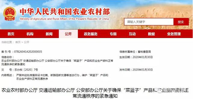 近期,因防范新型冠状病毒感染的肺炎疫情,一些地方“菜篮子”产品和农业生产资料运输受阻,出现蔬菜等“菜篮子”产品出不了村、进不了城,畜禽养殖所需饲料难以及时补充,种畜禽无法调运等问题。为确保“菜篮子”产品市场供应和农业生产稳定发展,现就有关事项通知如下。