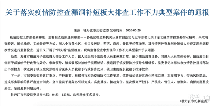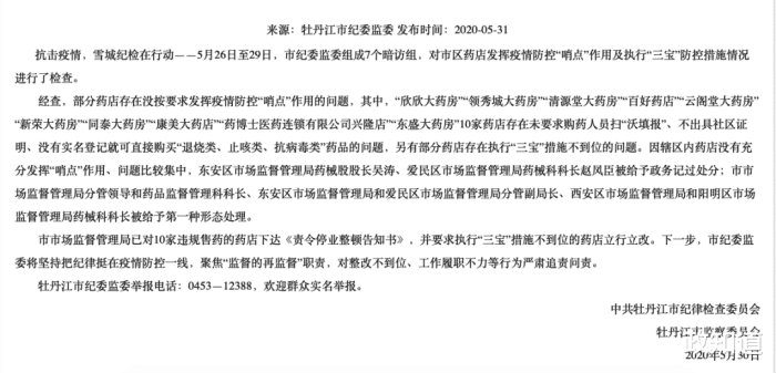 5月30日,牡丹江发布《关于市区药店发挥疫情防控“哨点”作用不力典型案件的通报》。